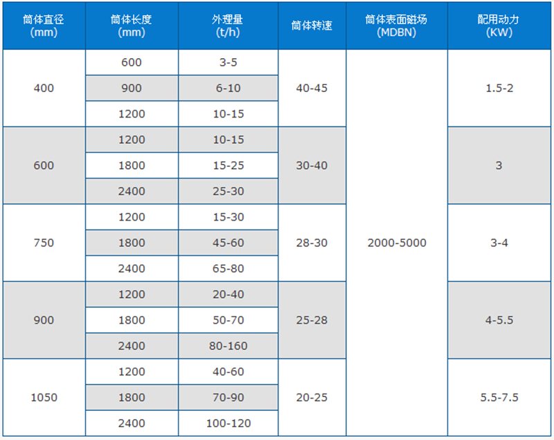 給礦箱將礦漿送入槽體,在磁場的作用下,磁性礦粒發生磁聚而形成“磁團”或“磁鏈”,受磁力的作用,向磁極運動,之后被吸附在圓筒上。“磁團”或“磁鏈”在隨圓筒旋轉時,會由于磁極交替產生磁攪拌現象,夾雜在“磁團”或“磁鏈”中的脈石等非磁性礦物會在翻滾的過程中滾落下來,最終被吸在圓筒表面的“磁團”或“磁蓮”即是精礦,非磁性或弱磁性礦物被留在礦漿中隨礦漿排出槽外,就是尾礦。
